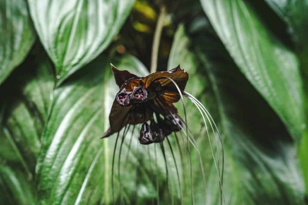 Seine Blüten locken Bestäuber an, während das dunkle Laub einen auffälligen optischen Effekt erzeugt.
