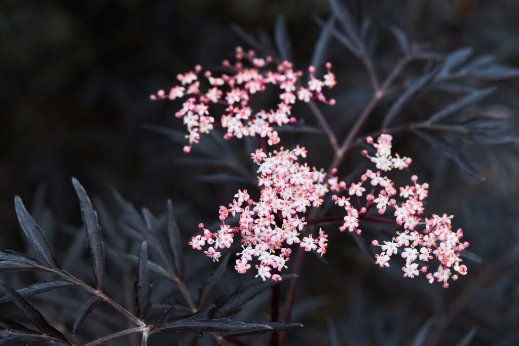 Der Schwarze Holunder wird für seine dunklen, spitzenartigen Blätter und seine rosa Blütenbüschel geschätzt.