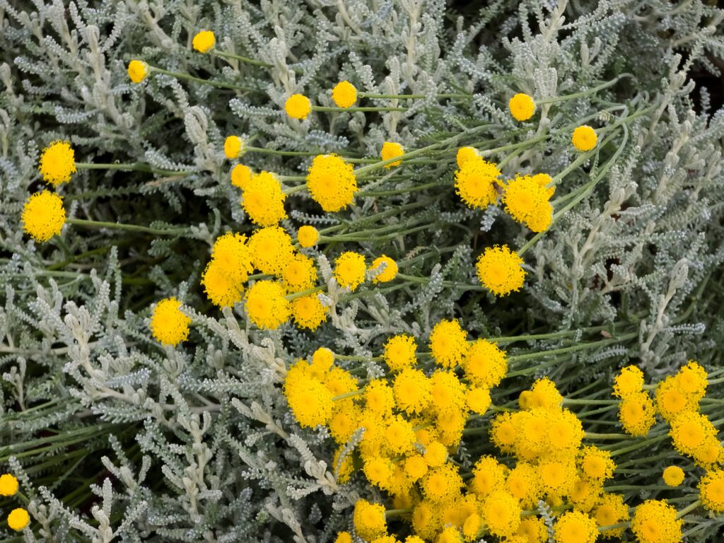 Santolina, oft auch als Lavendelwatte bezeichnet, wird wegen seiner aromatischen Blätter und fröhlichen gelben Knopfblüten geschätzt.