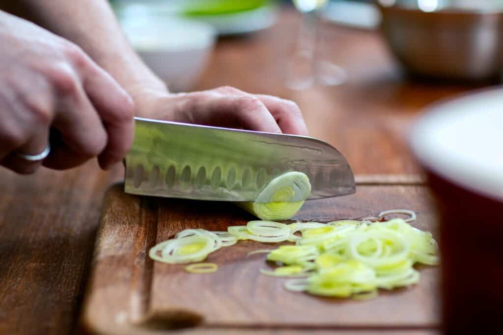 Schneiden Sie die Frühlingszwiebeln an der Basis ab, damit sie nachwachsen und kontinuierlich nachgeliefert werden können.
