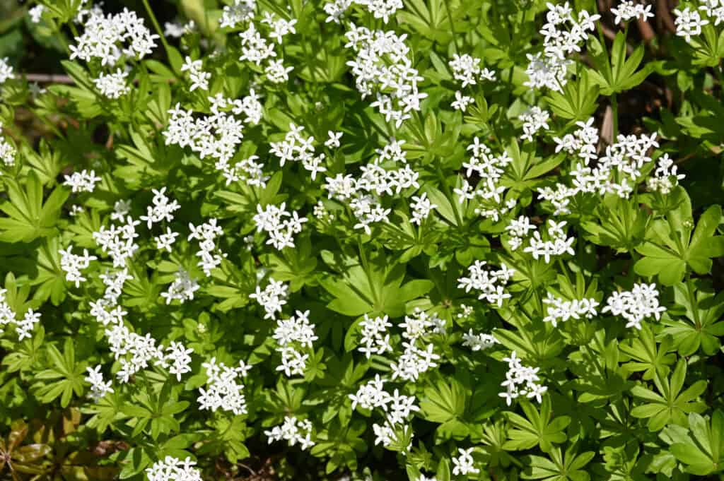 Echtes Waldmeister ist eine mehrjährige Pflanze, die an schattigen Standorten gedeiht und sich daher perfekt für Waldgärten eignet. Sie ist bekannt für ihre duftenden Blätter und bildet im Frühjahr zarte weiße Blüten.