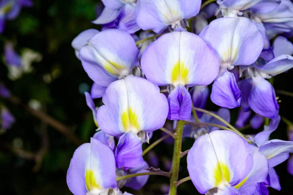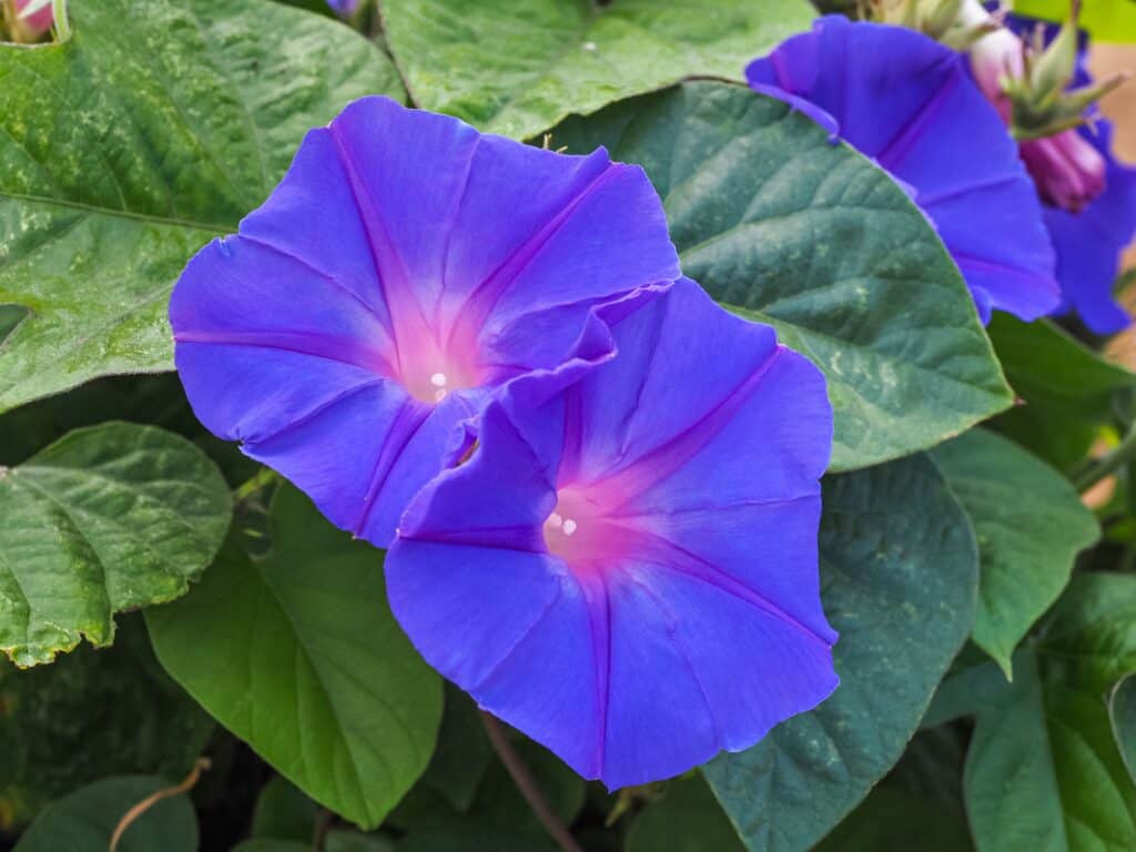 Passionsblumen sind bekannt für ihre seidigen violetten Blütenblätter und die flauschige weiße Mitte, die dem Vorfrühlingsgarten eine einzigartige Note verleihen.
