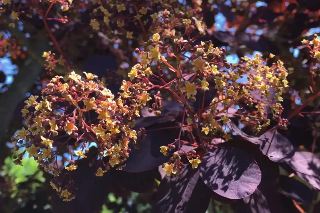 Auf den ersten Blick könnte man die violetten Blätter mit den Blüten verwechseln, aber das ist nicht der Fall.