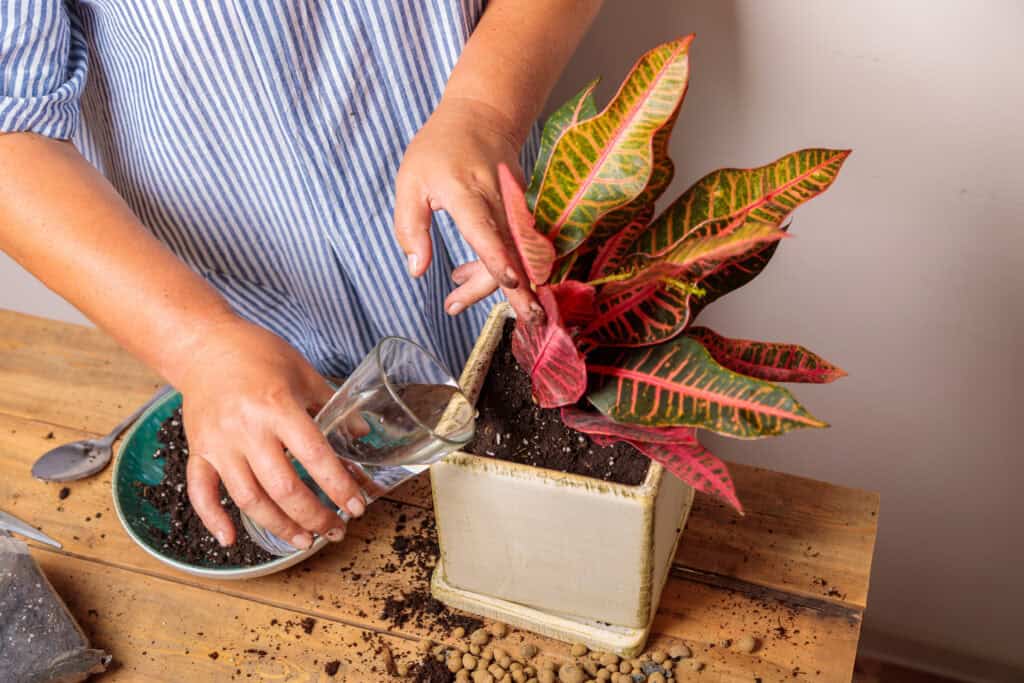 Tauchen Sie die Erde gut ein und lassen Sie überschüssiges Wasser vom Boden des Topfes abfließen.