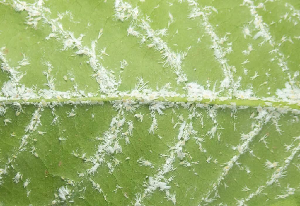 Wollläuse erscheinen als winzige, watteähnliche Gebilde auf den Pflanzen. Diese Schädlinge saugen den Pflanzensaft ab, schwächen die Wirtspflanze und fördern das Wachstum von Rußtau.