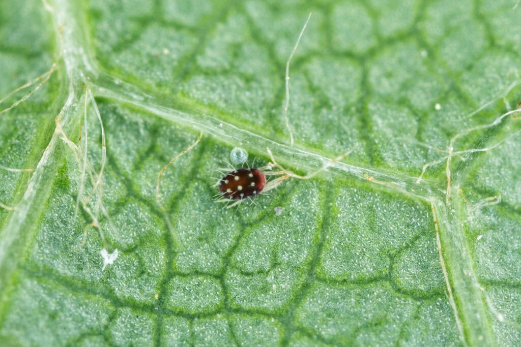 Spinnmilben sind winzige Schädlinge, die auf den Unterseiten der Blätter Netze spinnen. Ihr Fraß führt zu gesprenkeltem Laub und schließlich zum Abfallen der Blätter.