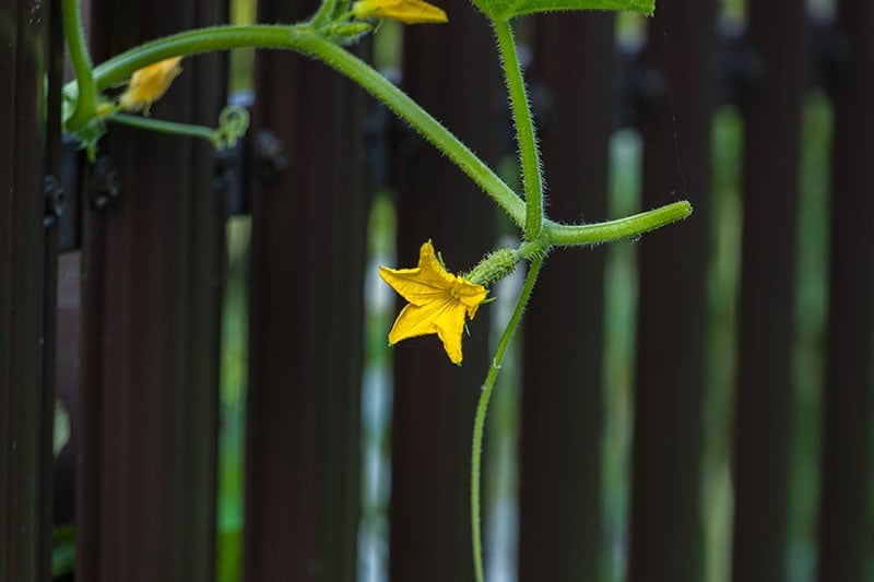 Jede Art von Zaun, ob mit Rautenmaschen oder aus Holz, kann als Rückgrat für deine Gurkenkultur dienen – außerdem können hübsche Pflanzen dabei helfen, die weniger attraktiven Teile des Zauns zu verdecken.